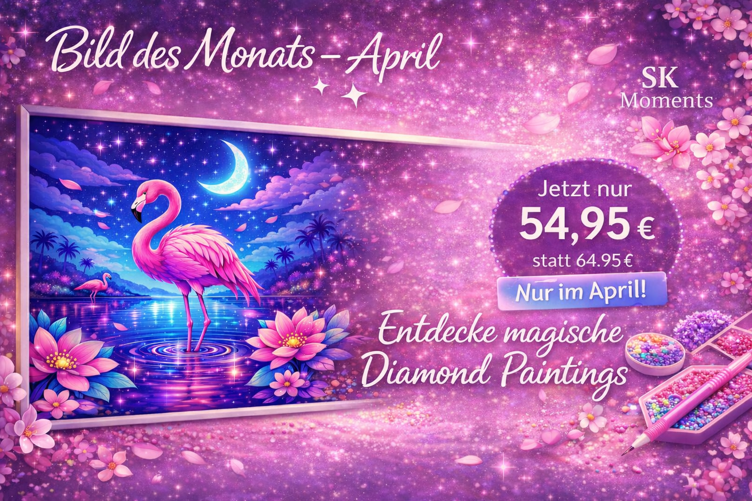 Erlebe kreative Entspannung mit unserem Diamond Painting des Monats. Nur im April erhälst du dieses besondere Motiv zum Vorteilspreis. Perfekt zum Abschalten, Dekorieren oder Verschenken.