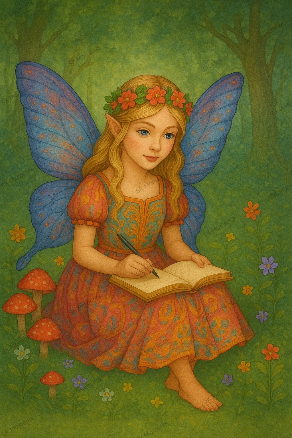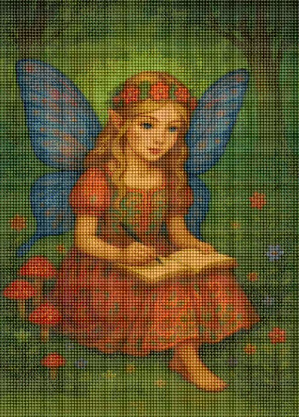 Tauche ein in eine zauberhafte Waldwelt mit unserem Diamond-Painting-Motiv "Die Tagebuch-Fee". Dieses kunstvolle Bild zeigt eine verträumte Waldfee, die inmitten von schimmernden Blumen und Pilzen in ihr Tagebuch schreibt. Ihre leuchtenden, regenbogenfarbenden Flügel und das reich verzierte Kleid machen dieses Motiv zu einem echten Highlight für alle, die Magie, Fantasie und filigrane Kunst lieben.