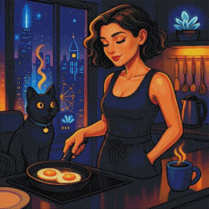 Wenn die Stadt noch schläft und die ersten Lichter im Fenster tanzen, beginnt ein stiller Moment voller Wärme. Während in der Pfanne das Frühstück brutzelt und eine Tasse Kaffee dampft, wacht auch die kleine schwarze Katze neugierig auf und begleitet den neuen Tag mit sanftem Schnurren. Dieses liebevoll gestaltete Motiv fängt die Ruhe des frühen Morgens ein - ein Augenblick zwischen Gemütlichkeit, Zuneigung und dem leisen Versprechen eines neuen Tages. Perfekt für alle, die die kleinen, stillen Glücksmomente des Alltags lieben.